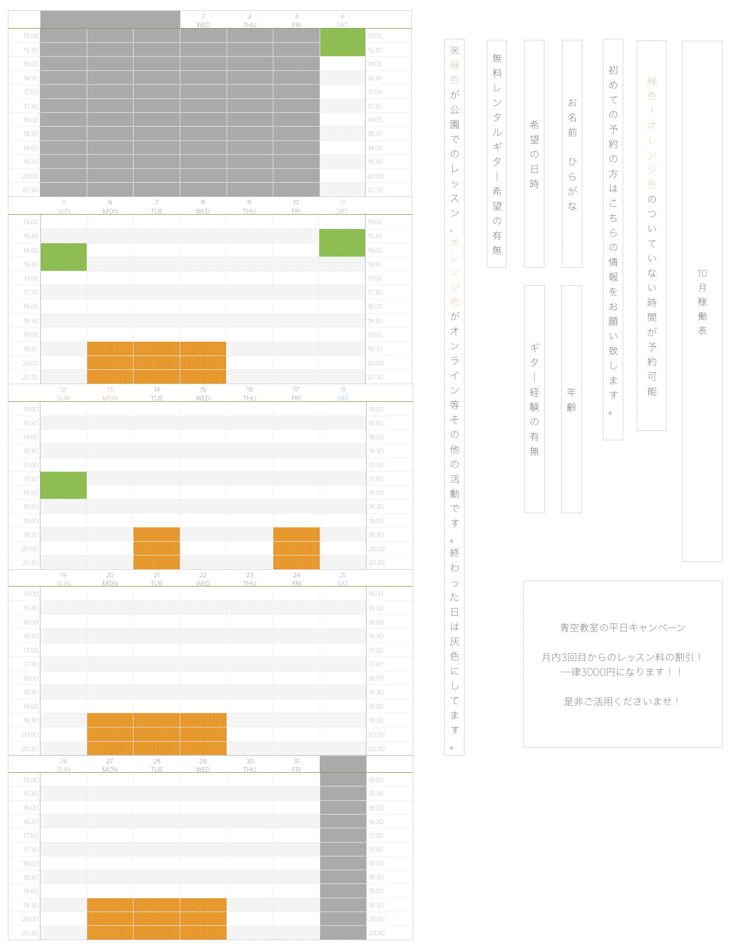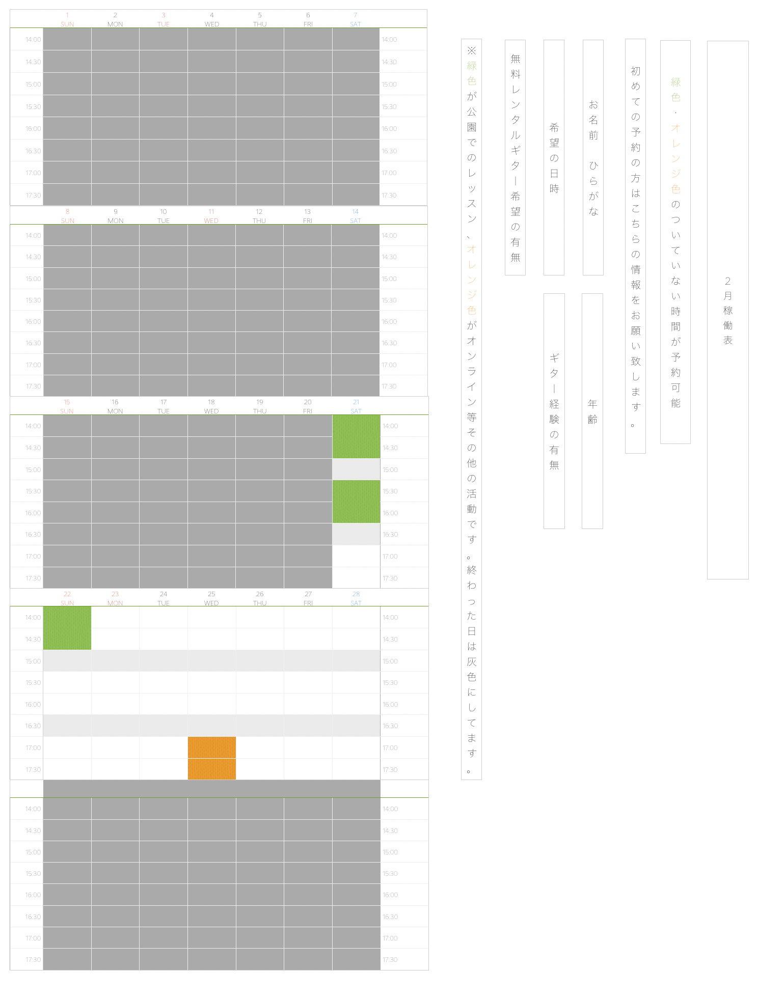レイクタウン公園の青空ギター教室/オンラインギター教室の受付可能時間