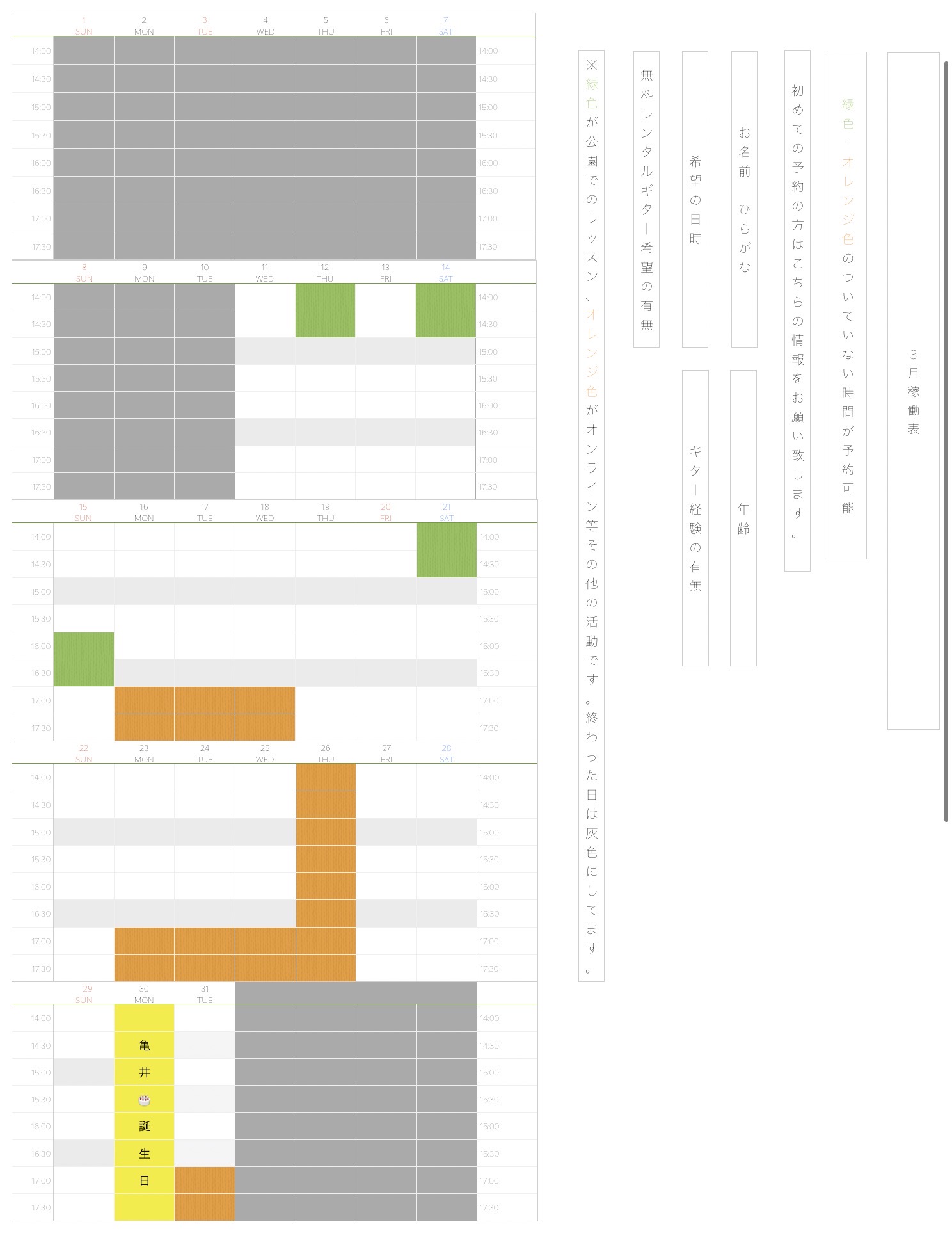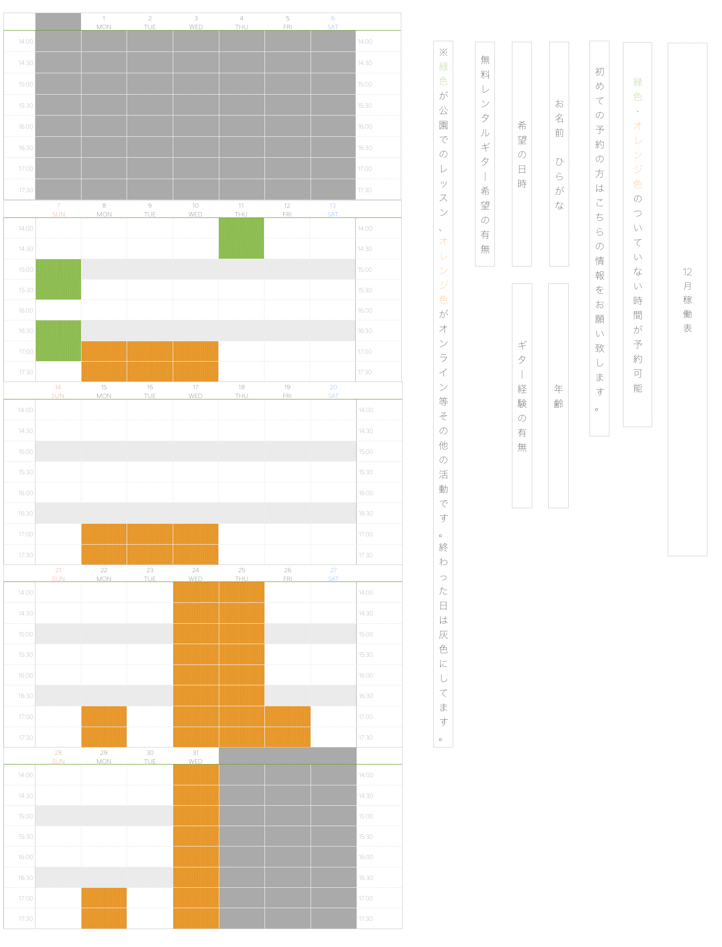 埼玉の青空ギター教室/オンラインギター教室の受付可能時間